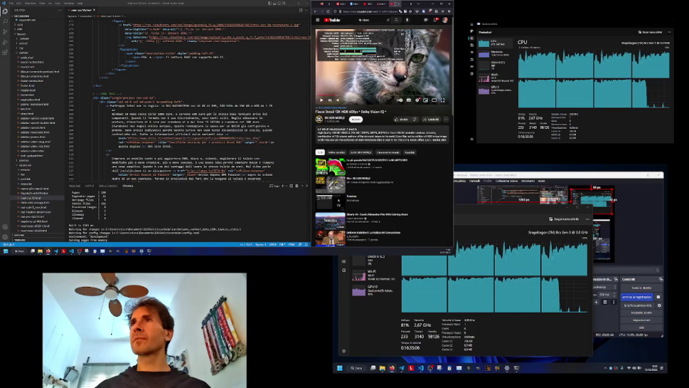 Nei primi minuti della video recensione ho dimostrato come le prestazioni di cui è capace siano più che sufficienti per la produttività da ufficio. Nella parte in cui è collegato al monitor 4K, con aperti VSCode, Firefox e 10 tab, YouTube 4K, e il tutto con OBS Studio in registrazione e HWInfo sotto, entrambi emulati anziché nativi, si dovrebbe intuire il livello raggiunto dalla piattaforma Octa Core di Qualcomm. Aggiungo che l’esperienza Windows è sempre piacevole, veloce, e reattiva anche nelle fasi di boot e sospensione quando si usa software nativo per arm64, proprio come ci si aspetta da un computer moderno di fine 2022.