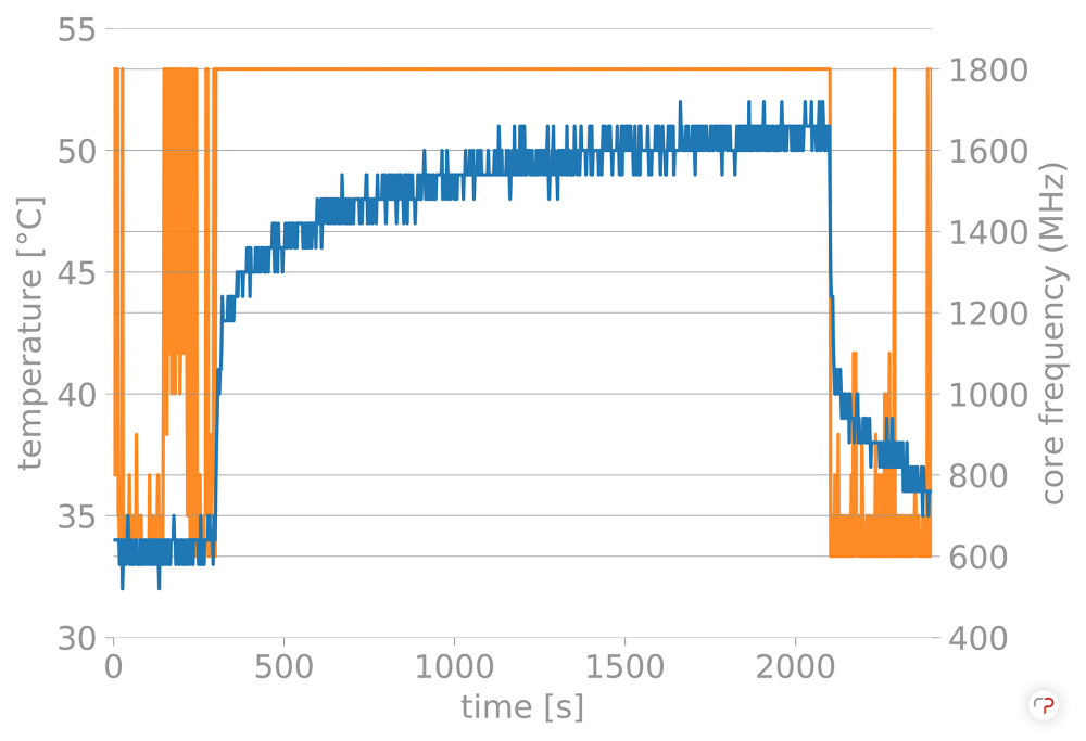 Le prestazioni bastano a farvi divertire. I 4 GB di RAM sono adeguati se non avete intenzione di virtualizzare o creare container Docker. La reattività dipende anche dalla velocità della scheda, ma notate una vera differenza solo quando aprite applicazioni grosse, tipo VSCode, LibreOffice o Gimp. Rispetto ad una Raspberry Pi 4, questo processore ha 300 MHz di frequenza in più e ha una dissipazione studiata e garantita. Ho fatto girare la suite di benchmark Stressberry sia in modalità standard (1.8 GHz) sia in modalità overclock (2.2 GHz, con Turbo fisso) e tirato fuori i grafici che vedete poco sotto. Le frequenze non crollano, non c'è thermal throttling perché le temperature sul sensore CPU non arrivano nemmeno a 70°C dopo 30 minuti di carico massimo.