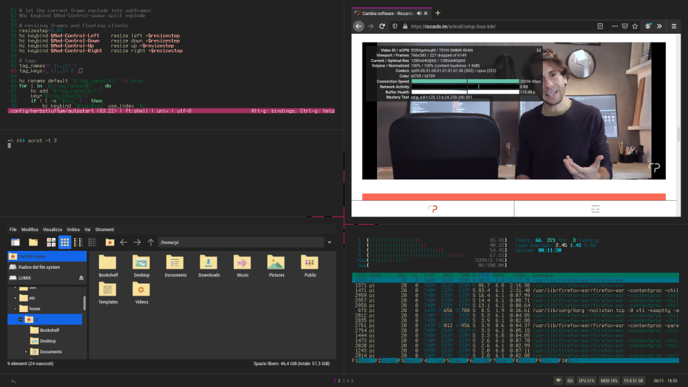 Alla fine dei (letteralmente parlando) giochi, ho scelto di lasciare la Raspberry Pi 400 con un leggero overclock di 2 GHz e di replicare il mio ultimo setup Linux su Raspberry Pi OS. Manjaro ARM in edizione Sway è troppo personalizzata e ancora un po' acerba (mentre scrivo, la scheda wireless non viene riconosciuta dalla ISO attuale), e lo Gnome 3.38 di Ubuntu 20.10 sacrificato su questo hardware. Così la base Debian, più Polybar, più Rofi, più Herbstluftwm e qualcosa di contorno, mi hanno garantito la personalizzazione e il gusto che cercavo. I dotfiles hanno avuto bisogno di qualche raddrizzata: Polybar richiede i moduli Raspberry per wireless e audio. Caricherò il pacchetto completo su Patreon tra pochi giorni. Non ho avuto il tempo di estremizzare nulla; dovrei partire dalla ISO base e poi aggiungere solo quel che serve; magari potrei ricompilare il kernel o riprovare Wayland con una versione vanilla di Sway; cercare informazioni su Chromium OS e capire se può essere adatta alle scuole, alla didattica a distanza con la Google Suite; installare Batocera 64-bit e provare a emulare quei giochi che un netbook 32-bit e x86 non regge.