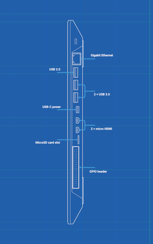 ProcessoreBroadcom BCM2711 (4-core) Cortex-A72 @ 1.8GHz Scheda videoBroadcom VideoCore VI Memoria4GB LPDDR4-3200 (saldata) ReteWi-Fi ac Dual Band / Bluetooth 5.0 / Ethernet 1000 Porte2x USB-A 3.0 / USB-A 2.0 / 2x microHDMI (max 4K60p) / USB-C (Power) / microSD / GPIO header 40-pin Alimentazione5V da USB-C (alimentatore esterno) Telaio286 × 122 × 23 mm / 385 grammi / 78 o 79 tasti AltroDecodifica H.265 (4Kp60) e H.264 (1080p60) / Codifica (1080p30)Prestazioni
