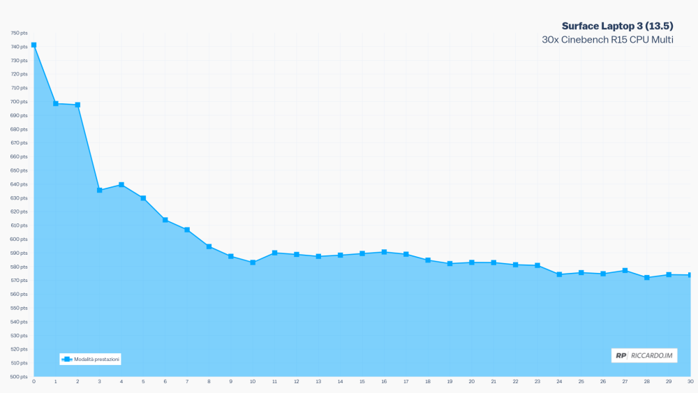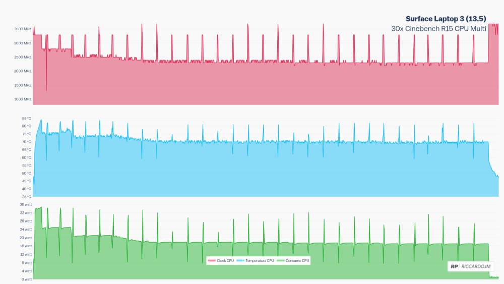 Il Core i5-1035G7 è un Ice Lake-U Quad Core da 15 watt (TDP) con frequenza di 3.7 GHz (singolo core), 3.6 GHz (due core) e 3.3 GHz (quattro core). È costruito a 10 nm. Surface Laptop 3 lo spinge fino ai 39 watt ma cerca di restare appena sopra i 15 watt e di raggiungere una temperatura regolare di 70°C. Siamo circa 20°C sotto un MacBook Pro o un Dell XPS 13 9380, per dire, che dalla loro hanno un sistema di smaltimento del calore a due ventole, molto più grosso. Per mettere sotto torchio l'hardware ho fatto girare per 30 volte di fila sia Cinebench R15 CPU Multi sia lo stress test di 3DMark Time Spy; poi ho fatto una conversione Handbrake di oltre 30 minuti, e dei rendering H264 con Adobe Premiere Pro CC 2019. Ne sono usciti i grafici di questa sezione ed i risultati dei benchmark del paragrafo più in basso.