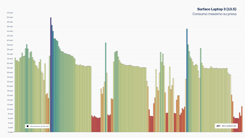 Surface Laptop 3 ha un draining basso, molto basso, ed è una bella notizia perché c'è il Connected Standby attivo e l'Instant On, una delle buone cose del Project Athena di Intel. L'ho accennato sopra e posso aggiungere che mettere le mani su Windows non è mai stato tanto veloce. È anche merito dello sblocco Windows Hello con la camera IR: quando ho il caschetto per le riprese non mi riconosce, ma è fulmineo e non mi obbliga a stare lì davanti in posa.