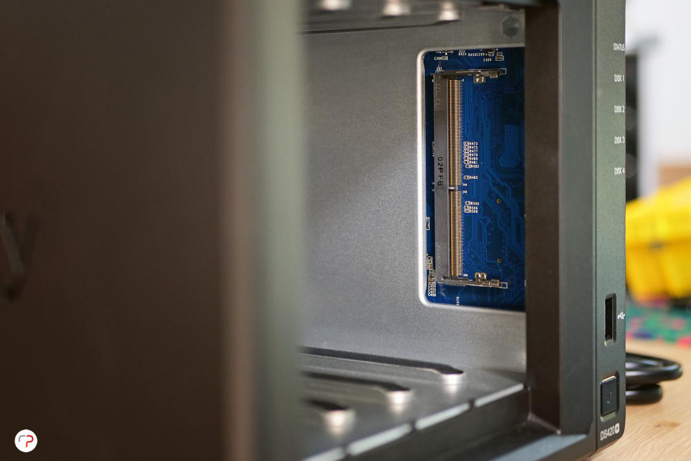 DS420+ ha 2 GB di RAM saldata su scheda e uno slot per DDR4-2666 libero e accessibile togliendo i dischi. Secondo Synology, si può installare un banco da 4 GB per portare la RAM totale a 6 GB, ma online ci sono testimonianze di utenti che hanno installato un banco da 16 GB (Crucial, ma è un dettaglio) per arrivare così a 18 GB di RAM totali. Niente da fare, invece, con un banco da 32 GB. La procedura non è ufficiale e non è detto che Synology decida di vincolare l'hardware ai 6 GB previsti.